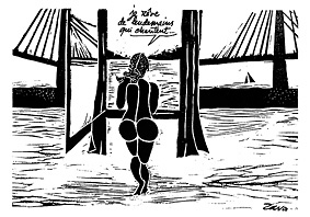 56 PONTS DE VUES. Don Versquoy disait de la série Bridges for.: "La poésie plastique de Zav est l'écho probable de la chute vertigineuse d'un pétale de rose lâché dans le vide du Grand Canyon...". A quoi, Gigi Lisbonne, critique d'art au Courrier du Centre International d'Etudes Plastico-poétiques de Knokke-le-Zoute, répliquait : "Zav dispose d'un extraordinaire bouquet de roses - on comptabilise ce jour plus de quatre cents Bridges for. - probablement toutes issues des serres hollandaises de Haarlem, qui lui permettent d'amplifier substantiellement la probabilité improbable du célèbre écho arizonien, si souvent cité dans les cercles d'art maximalistes". A propos des Bridges for., on évoque parfois l'histoire des filles Vahva De Rettro. La première, dont la noble tête a été effleurée dans son berceau par un pétale de violette, on l'a appelée naturellement Marguerite. La deuxième, par une raison identique, on l'a appelée Violette. Le troisième - tiens, un garçon ! - on l'a appelé Parpaing. On se demande encore pourquoi. En somme, Bridges for., est un jeu de probabilités certifié par Versquoy ? Lisbonne.