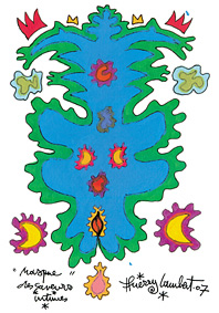 Thierry Lambert est un résistant avec tous ceux qui ignorent le flux tendu, le juste temps, c'est aussi le ciel qui descend, l'enfer qui monte. Toute explication est superflue. Ni droite, ni gauche, ni dedans, ni dehors parmi ces mandalas-totems arrivés du passé, arrivés de l'avenir dans les mains et le regard de Thierry Lambert, médium.