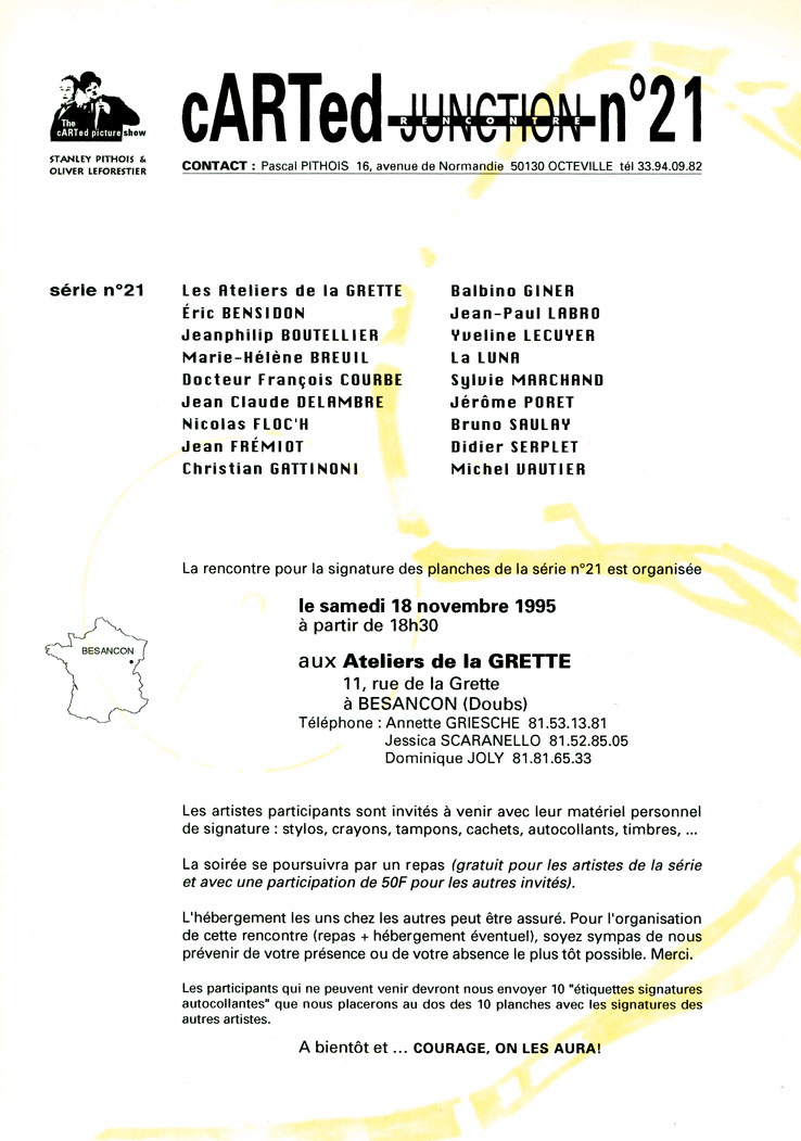 J'ai toujours en tête ces images filmées par Bernard Martin de la première rencontre cARTed aux Ateliers de la Grette en 1995, juste un plan fugace où l'on voit Annette Griesche en discussion avec Hervé Leforestier, hors champ. Pourquoi cette séquence me marque-t-elle autant, elle présente tous les stigmates de la banalité navrante du quotidien, une réalité brute, un lavabo, un robinet qui coule, une Annette à l'air un peu speed comme elle sait si bien être, affairée à la préparation de la soirée. Pourtant je sens poindre sur ces images une atmosphère décalée, une disponibilité joyeuse, la promesse d'une belle rencontre. A Besançon il n'y a que de belles rencontres.